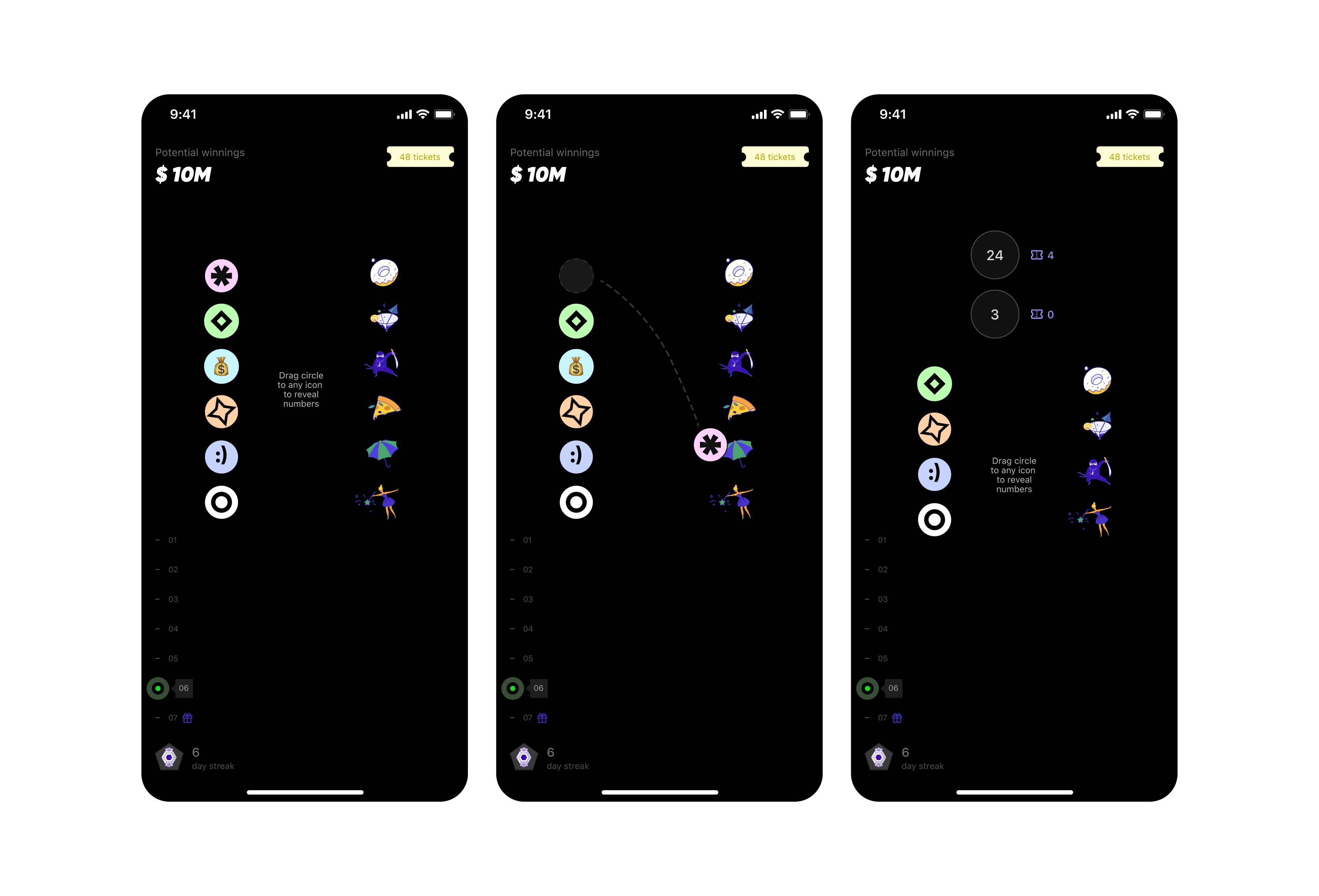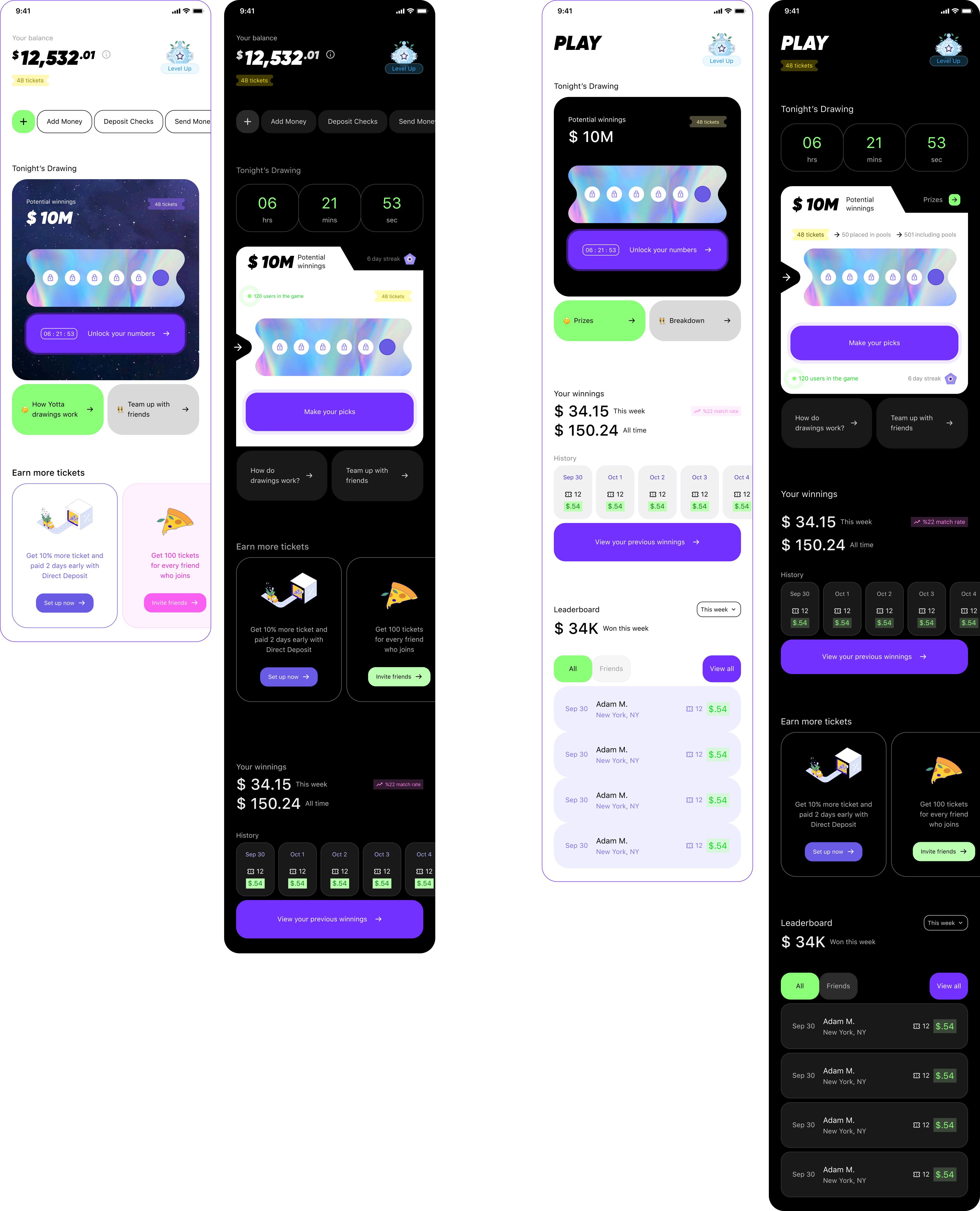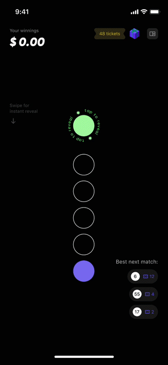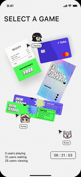The Play tab encompasses Yotta’s main selling point: gamifying banking by pairing lottery with savings. The redesign transforms a data-intensive UI into an intuitive, engaging experience. By introducing interactive games, number reveals were transformed into an engaging experience that highlights Yotta’s unique and exciting spin on the industry.