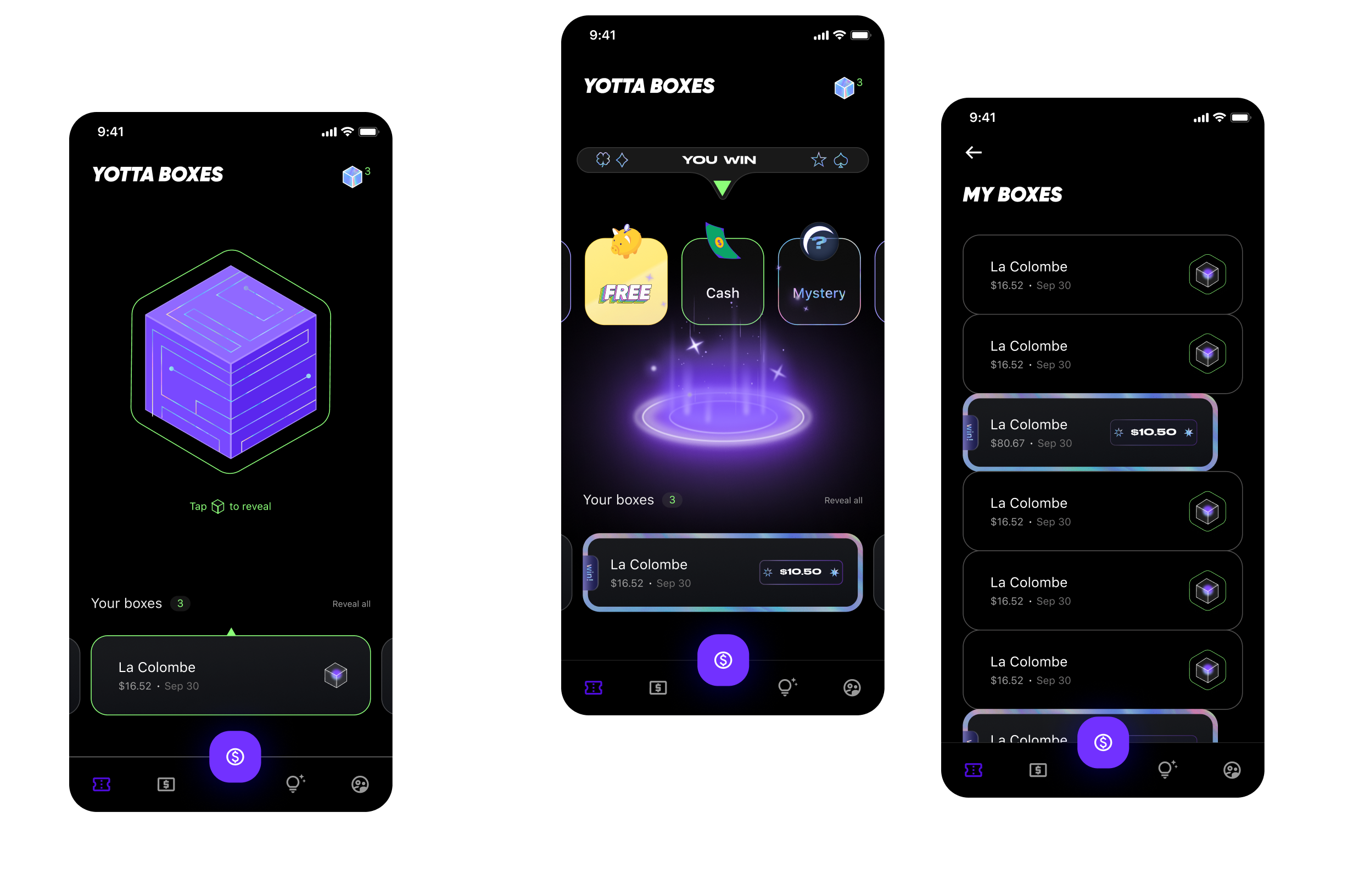 We also designed a new core feature: Yotta Boxes. A user receives a Yotta Box on every Yotta Debit or Credit Card transaction. Gaining inspiration from traditional gaming VFX, we turned daily transactions into a unique and rewarding in-app game experience, encouraging users to use their Yotta cards.